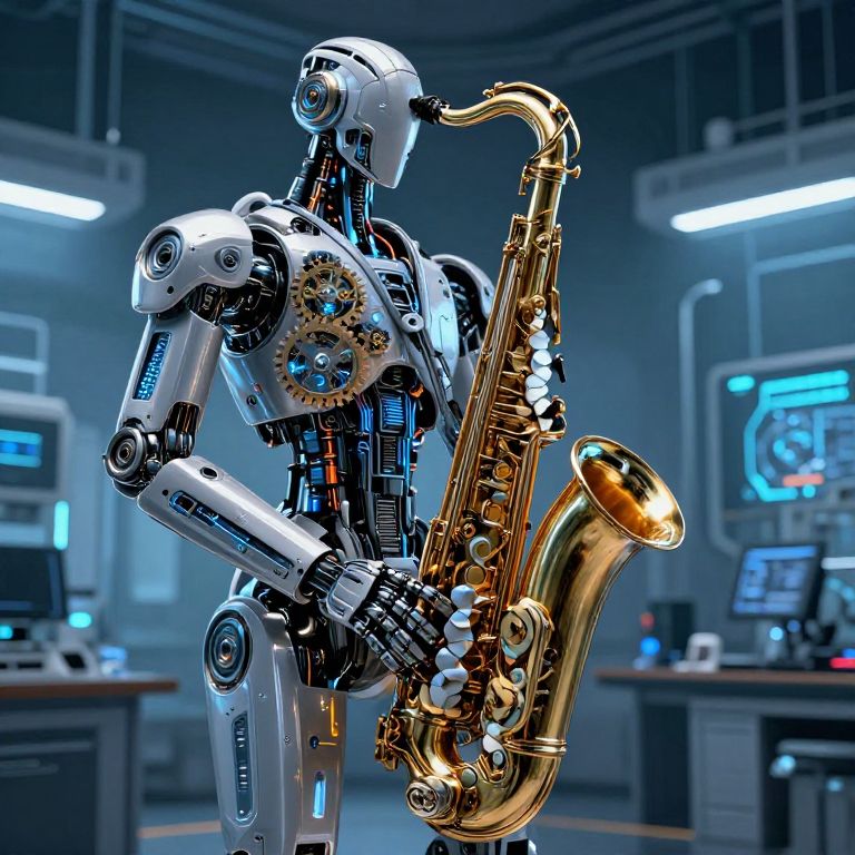 Photograph of a futuristic, silver robotic figure playing a golden saxophone in a high-tech laboratory. The robot's metallic body features intricate gears, blue-lit joints, and a white helmet with a circular sensor. The background includes blurred computer monitors emitting blue light, and grey desks with various equipment. The robot's left hand holds the saxophone's neck while the right hand operates the keys, creating a dynamic, musical pose. The overall scene blends science fiction elements with a musical performance.