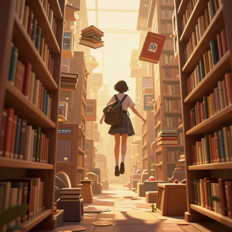 In a whimsical, cyberpunk-inspired 3D-rendered alleyway, readers gracefully glide through the air between floating bookshelves, their enchanted journey illuminated by warm, golden-hour lighting as they navigate this surreal, high-definition fantasy world.