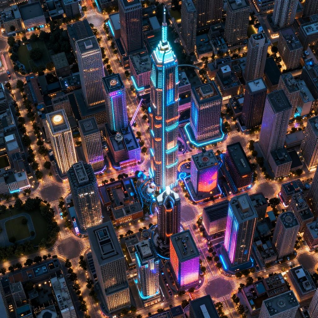 Map AI generator creating a futuristic cityscape layout with glowing neon streets and advanced transportation networks, detailed satellite view blending realism and sci-fi elements, vibrant colors and dynamic lighting effects.