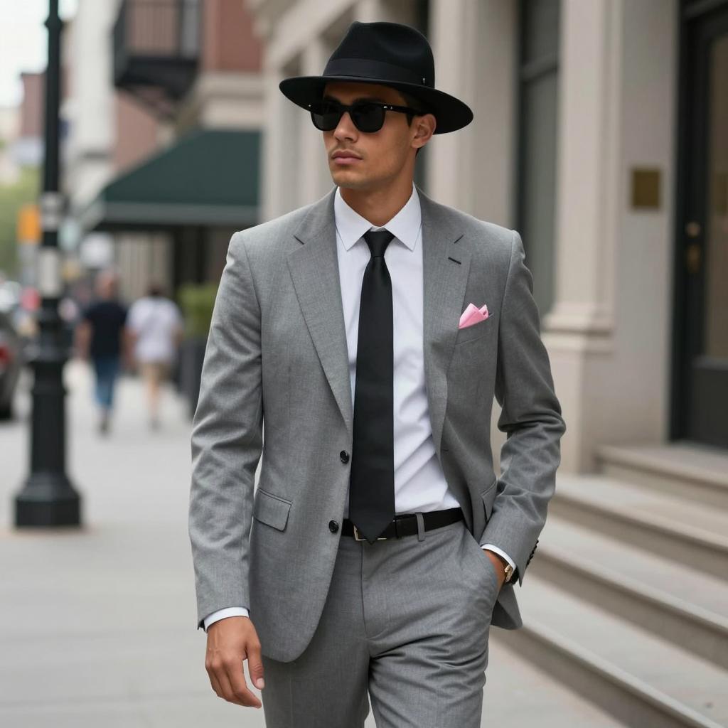 Blues brothers suit costume, photograph of a handsome young man, standing on a city street, wearing a gray suit, white shirt, black tie, black fedora, and black sunglasses, hand in pocket, pink pocket square, urban background, daytime, street buildings, steps on the right, casual yet stylish, confident expression, modern fashion, medium shot, slight blur in background