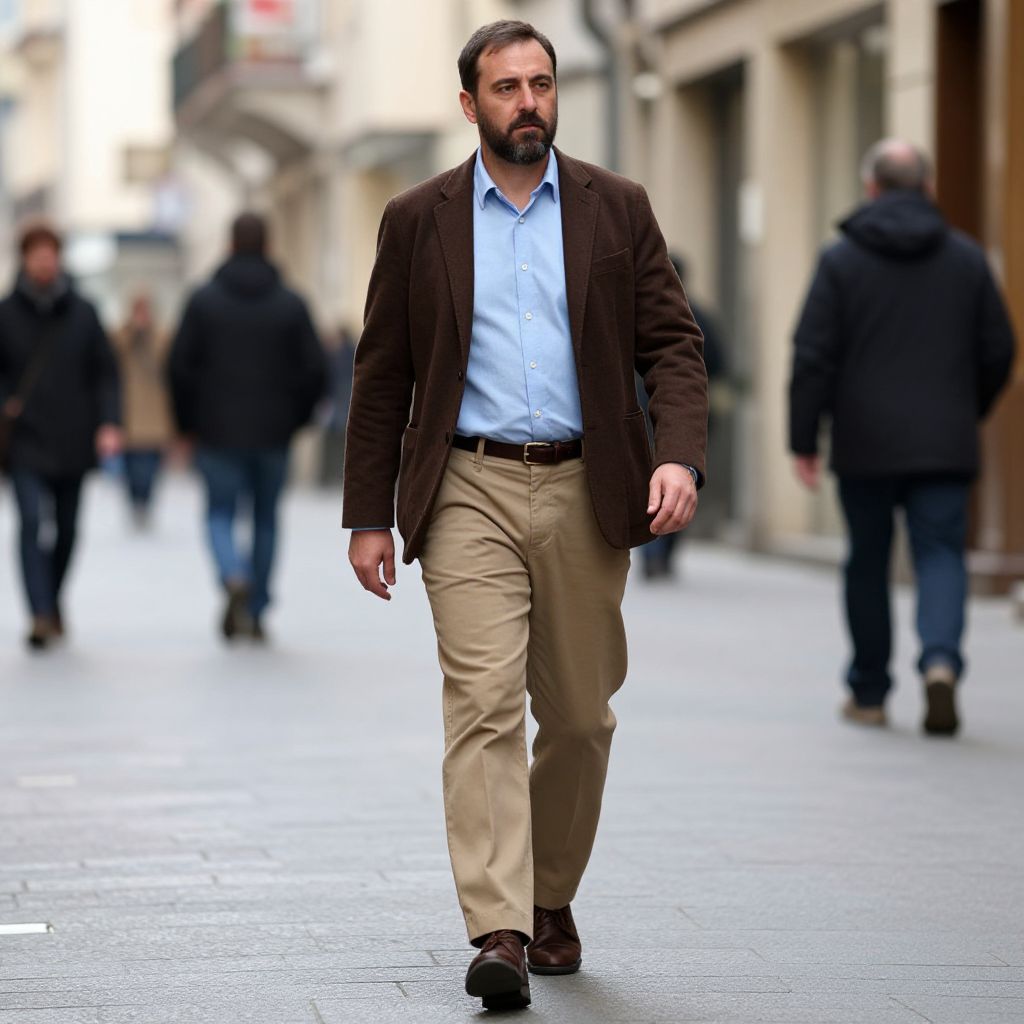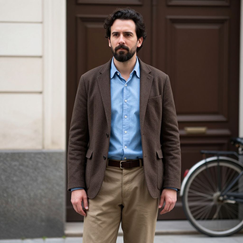 Photograph of a bearded man leaning against a stone wall in a cobblestone courtyard. He's wearing a long, black wool coat over a gray shirt and pants, with brown boots. His hands are in his coat pockets, and he has a serious expression. The background includes a stone building with a wooden balcony and potted plants. The overall vibe is casual and slightly chilly.