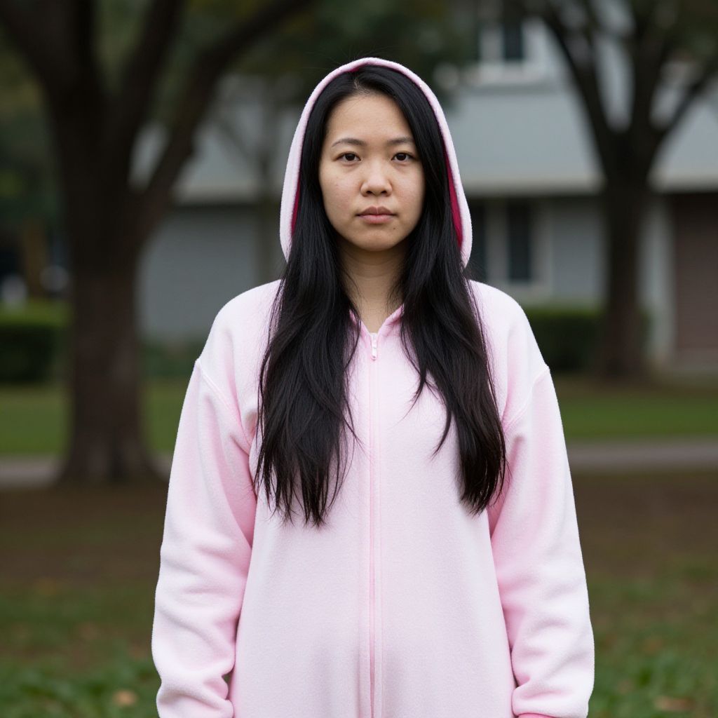 Photograph of an Asian woman with long black hair standing in an outdoor park. She's wearing a light pink onesie with a hood, which has pink inner lining. Her expression is neutral, and the background shows blurred trees and a gray building. The pink onesie contrasts with her dark hair and the natural greenery behind her. The overall mood is calm and slightly whimsical.