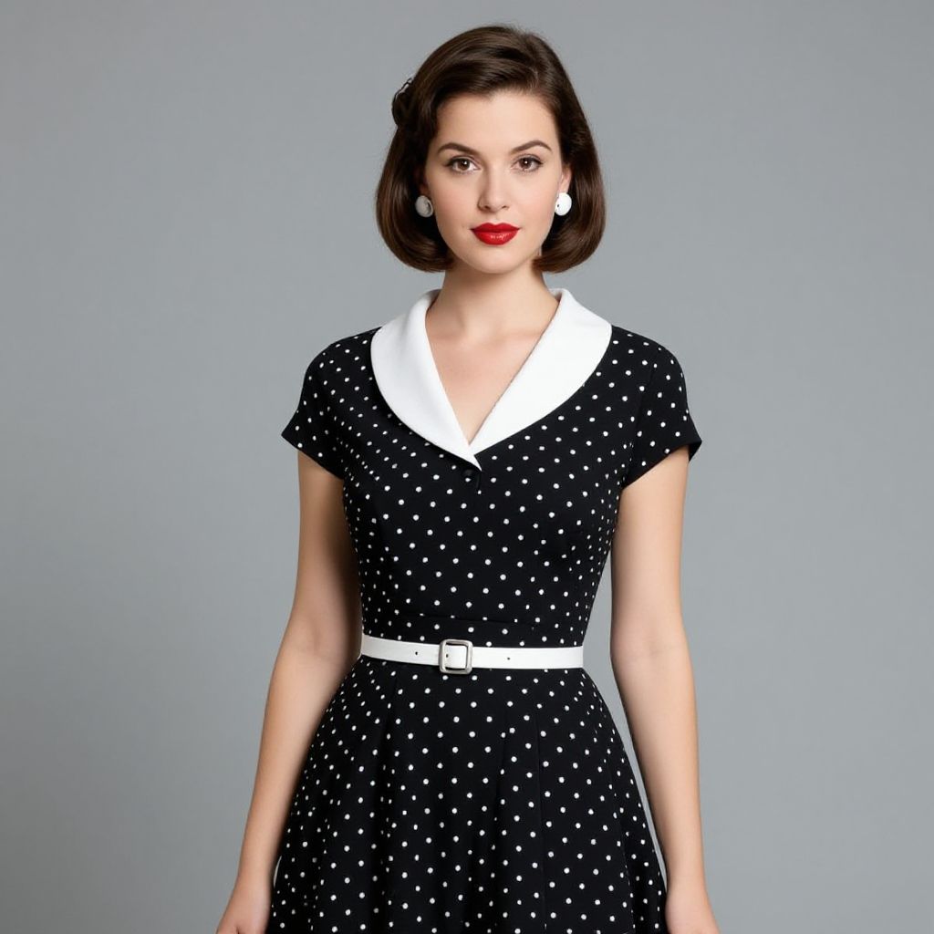 Portrait of a young woman with a brunette bob hairstyle wearing a classic 1950s style black polka dot vintage dress with a modest white collar and matching belt. She accessorizes with white round earrings and red lipstick, embodying mid-20th-century fashion elegance.