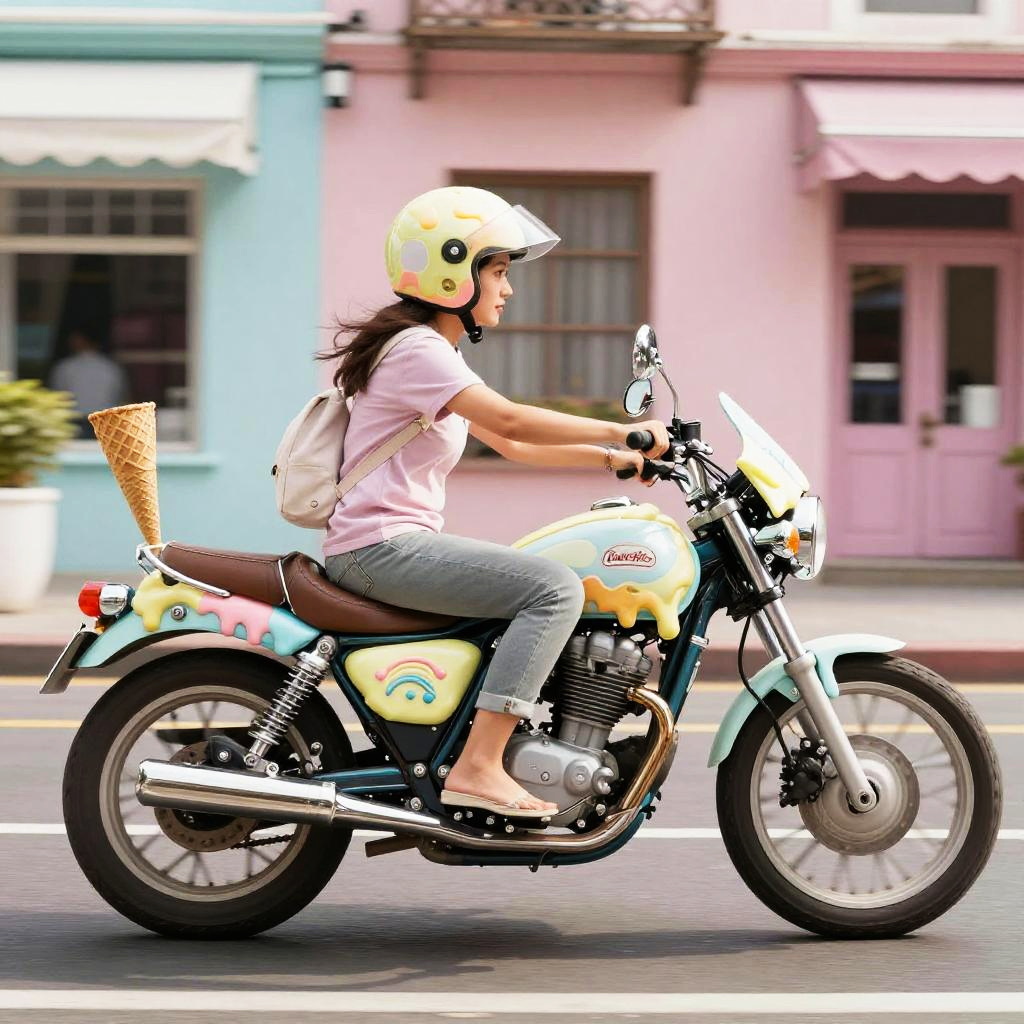 Ice cream motorcycle cruising through a vibrant city street, pastel colors, melting cones on the sides, whimsical design, sunny day, detailed bike engine, playful vibes