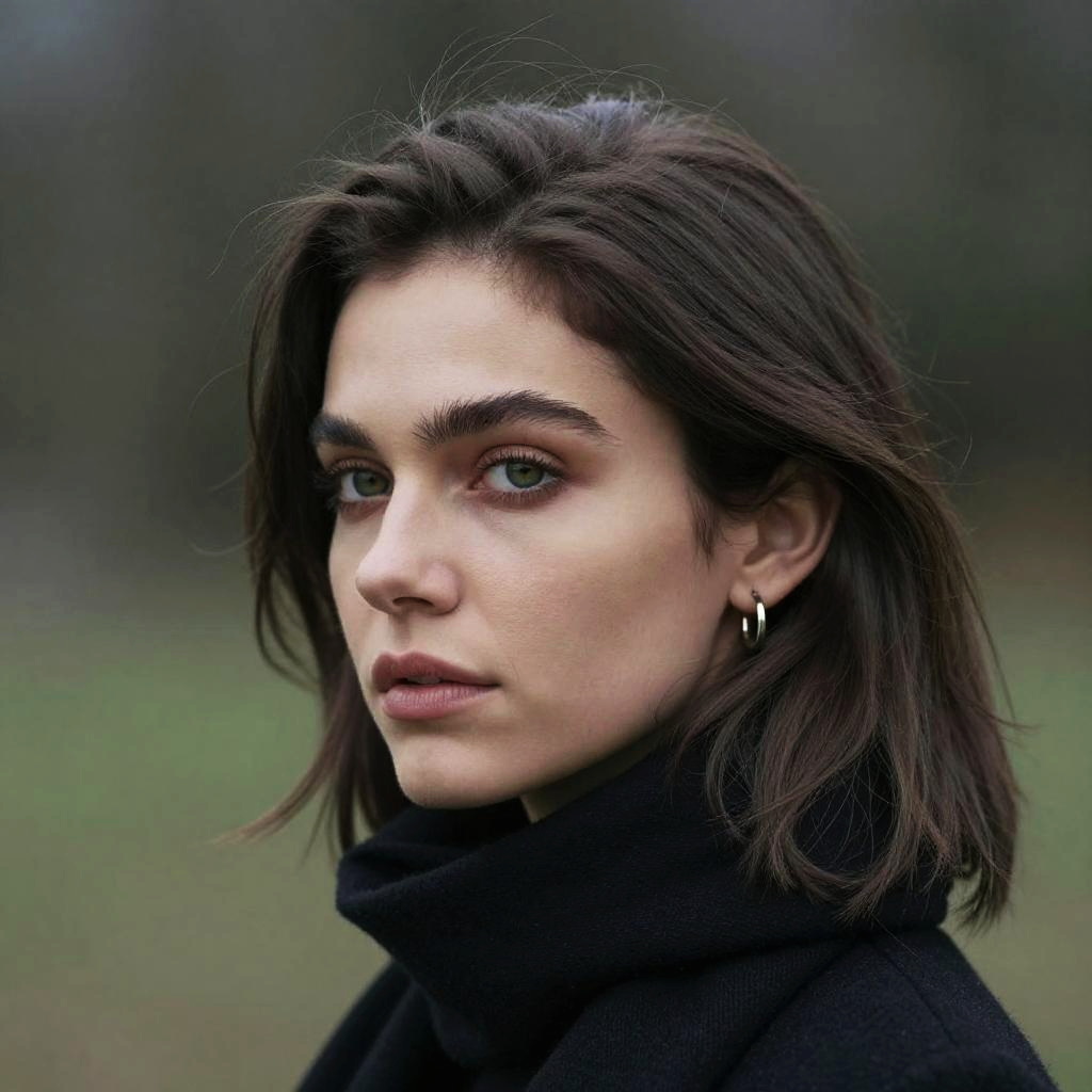 Photograph of a young woman with pale skin and dark brown, shoulder-length hair. She has prominent, dark eyebrows, green eyes, and full lips with a neutral pink shade. She is wearing a black, high-collared top and small hoop earrings. The background is a blurred, outdoor setting with green and brown hues, suggesting a natural, possibly forested environment. Her expression is neutral, and the lighting is soft, highlighting her facial features. The overall style of the photograph is realistic and naturalistic.