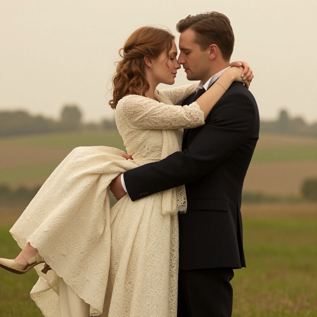 Romantic embrace captured in vintage elegance as a man in a dark suit holds a woman in a cream lace dress, set against a serene pastoral backdrop.