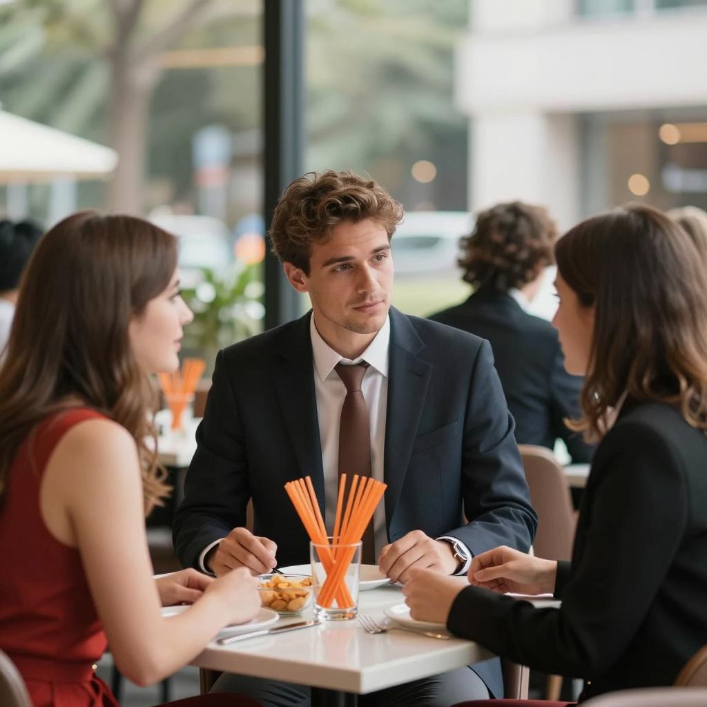 Photograph of a convenience store. Man with dark hair, black jacket, and light gray shirt stands behind counter, smiling. Woman with dark brown hair, gray off-shoulder top, and black apron stands in front, smiling back. Neon signs with Cyrillic in background. Counter with cash registers, snacks, and coffee cups. Shelves with packaged goods on left. Bright, indoor lighting. Two people.