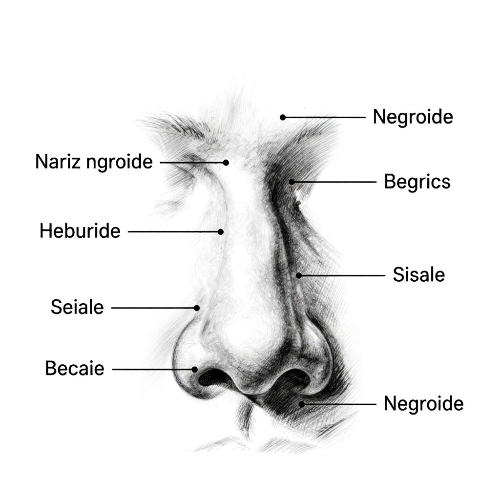 Nariz negroide, scientific anatomical study, labeled parts of the nose, monochrome pencil sketch style, educational illustration, clear lines, textured shading