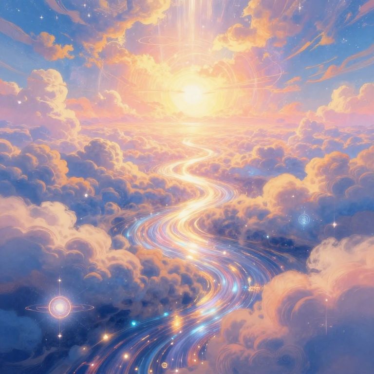 Empyrean realm depicted as an endless horizon of glowing clouds and radiant light, celestial rivers flowing with sparkling stardust, abstract cosmic symbols glowing softly, a divine atmosphere of tranquility and infinite beauty, painterly style with vibrant color palette