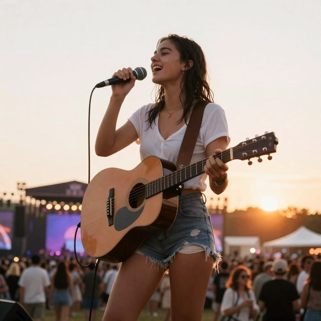 Masterpiece, 1girl, realistic, raw photo, (((((full body))))), large breasts, brown hair, black eyes, fitness, 26 years old, (wet hair:1), wearing white shirt, wearing shorts, sunset lighting, perfect lighting, ((singing)), ((playing guitar:1)), ((((laughing)))), (((looking to the sky))), ((one hand hoding mike)), ((((from below)))), outdoor concert, summer festival, huge crowd, crowded