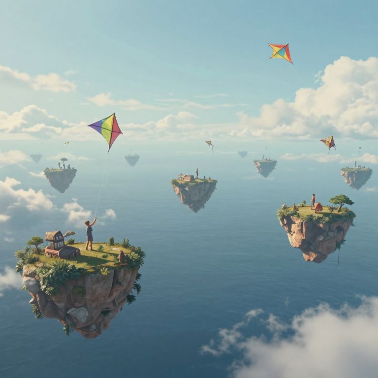 A colony of floating islands drift lazily through an endless sky-ocean, their inhabitants trading memories using kites that siphon nostalgia from the clouds.