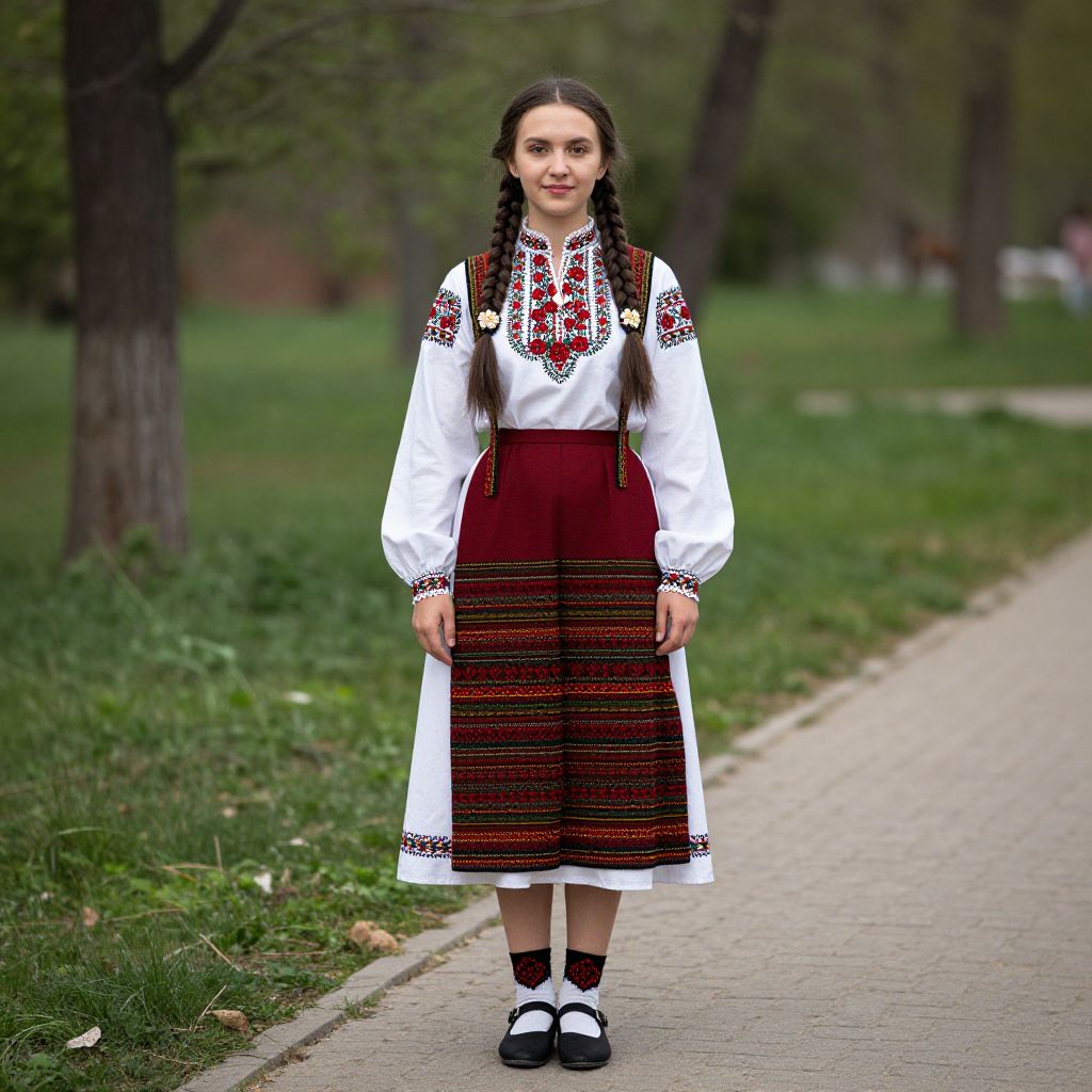 A photograph of a young girl with fair skin and dark brown hair in two braids, standing on a paved path in a park. She wears a traditional white blouse with red and black embroidery on the chest and sleeves, and a high-waisted, dark red, long skirt with black and red horizontal stripes. She has white socks and black Mary Jane shoes. The background shows green grass, trees, and a blurred path. The overall style is folkloric and the setting is natural and serene.