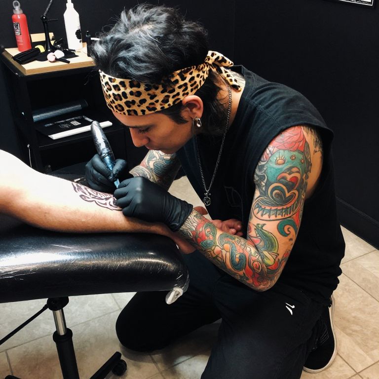 Photograph of a heavily tattooed person with dark hair, wearing a leopard-print headband, black gloves, and black clothing, tattooing an arm in a dimly lit tattoo studio. Their arms and torso are covered in vibrant, colorful tattoos. They're kneeling on a tiled floor, focused on their work. The background includes tattoo equipment and supplies on a shelf. The image has a high-contrast, slightly gritty style.
