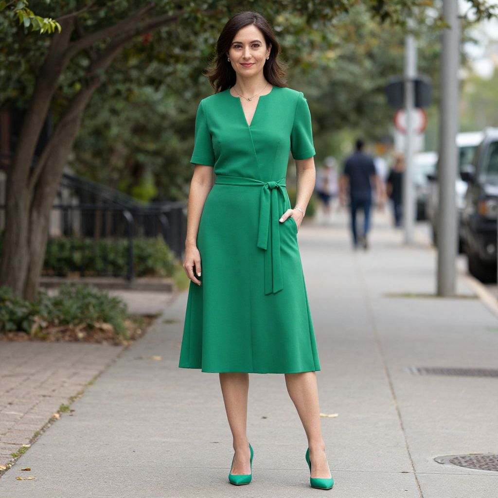 Photograph of a woman with medium-length dark hair, wearing a green dress with short sleeves and a tied waist, and matching green heels, standing on