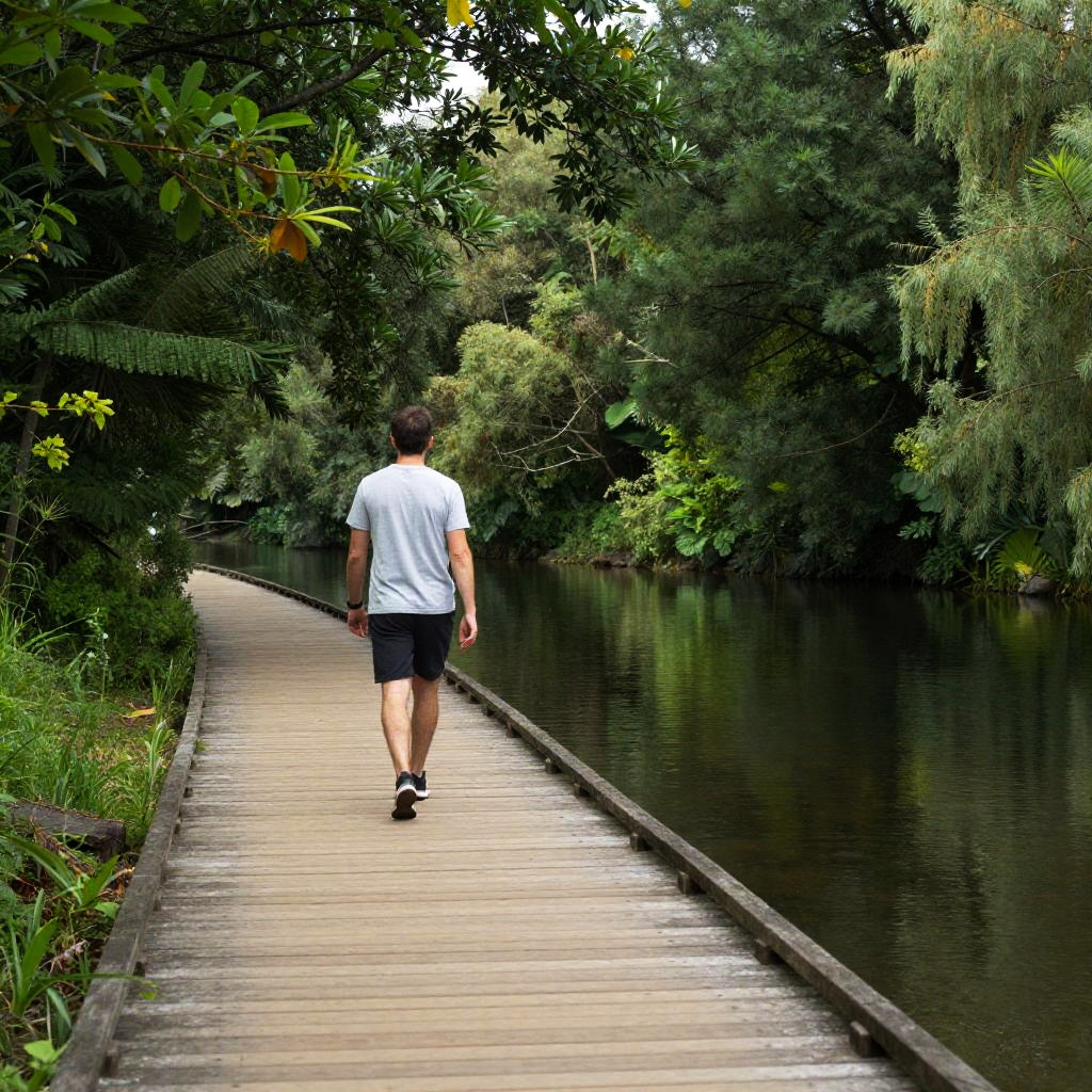A man wearing a light grey t-shirt, black shorts, and sneakers walks along a wooden boardwalk beside a calm river, surrounded by dense green foliage and trees in a forest setting. The peaceful natural environment highlights the serenity of the outdoor scene.