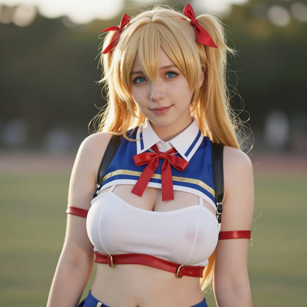 Sexy cosplay woman character wearing Shouko Nishimiya costume. Realistic photo. Jane Doe dressed as Shouko Nishimiya. Realistic photo, caucasian woman, pretty cute face, very big breasts, outdoors, cheerful lifestyle vibe, golden hour