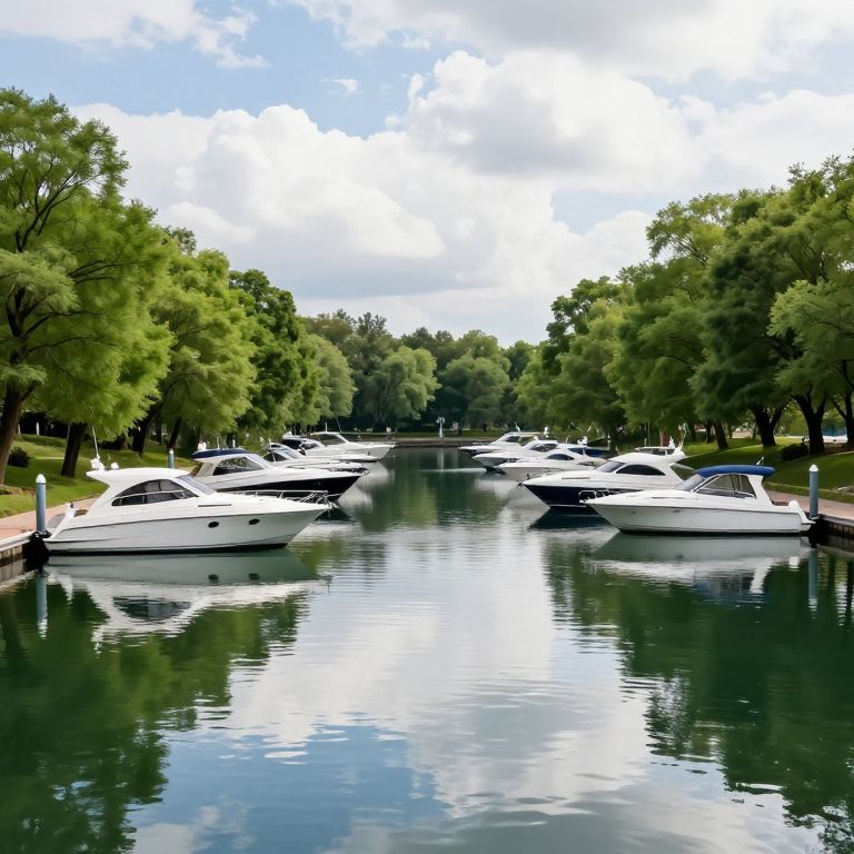 Lush green trees line both sides of a serene bay, where numerous sleek white and blue motorboats are docked along two parallel piers, reflecting the tranquil waters beneath a partly cloudy sky.