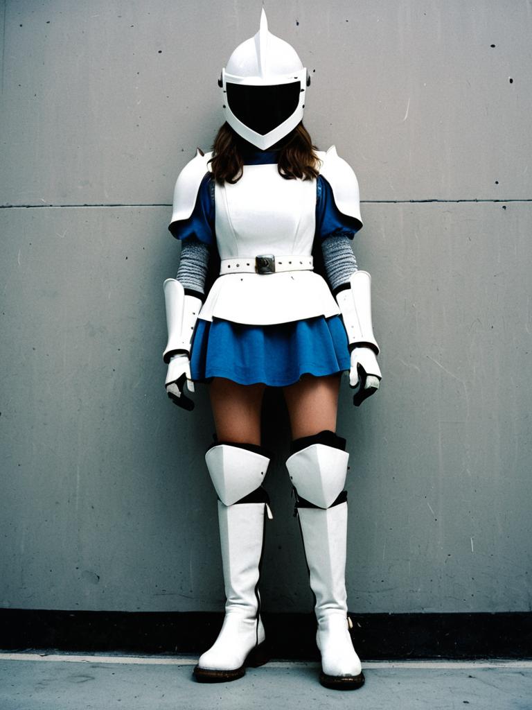Full-body portrait of a woman dressed in white knight armor with a white helmet, knee pads, and gloves. She is wearing a blue dress underneath the armor and white boots, standing against a plain wall. Her brown hair is visible beneath the helmet.