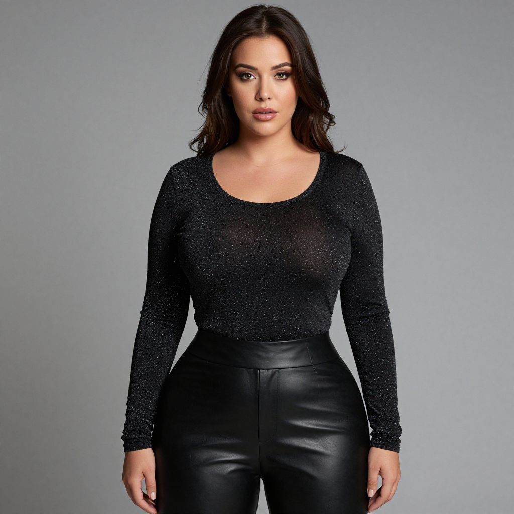 "Woman, glam, black glittery long-sleeve top with relaxed fit, scoop neckline, faux leather pants, fitted silhouette, mid-rise waist.. Sexy. Pretty face and beаutiful eyes. Big breasts."