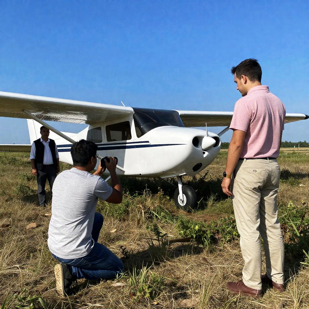 Photograph of four men near a small white airplane in a grassy, bushy area. Two men kneel in the foreground, filming, one man stands to the right, and another man stands in the background. Clear blue sky. Plane's wing and tail visible. Green foliage surrounds. Kneeling men wear casual clothing, standing man in a pink shirt and beige pants, background man in white shirt and black vest. Bright daylight.
