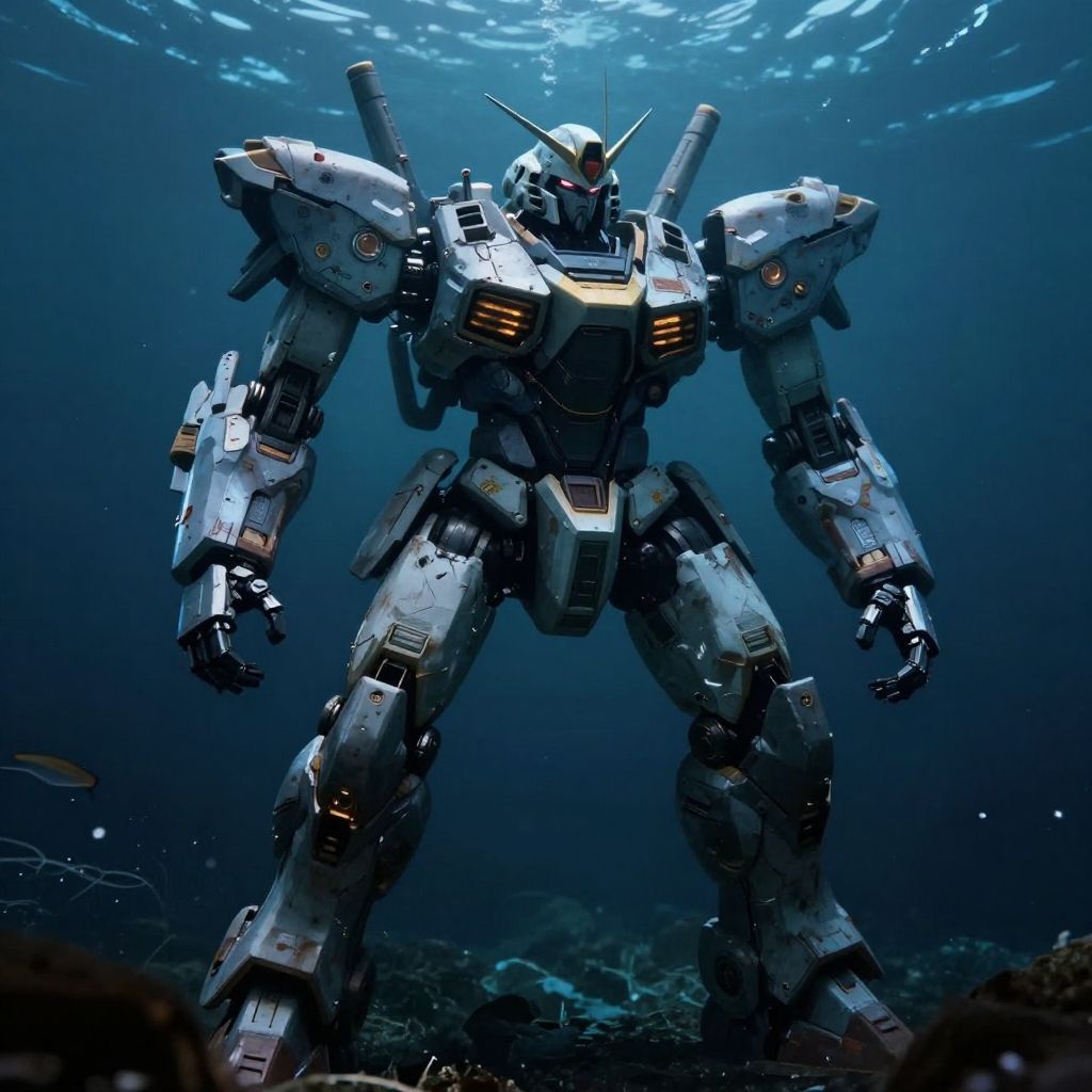 Photorealistic CGI image of a towering, humanoid mecha robot standing underwater. The robot has a metallic, grayish-blue armor with yellow and white accents, and intricate mechanical details. Its large, armored hands are clenched, and it has four cylindrical weapons protruding from its back. The mecha's head features a prominent antenna and glowing red eyes. The background is a deep blue, with sunlight filtering through the water, illuminating small fish and coral around the robot's legs. The overall atmosphere is dark and mysterious, with the mecha appearing imposing and powerful.