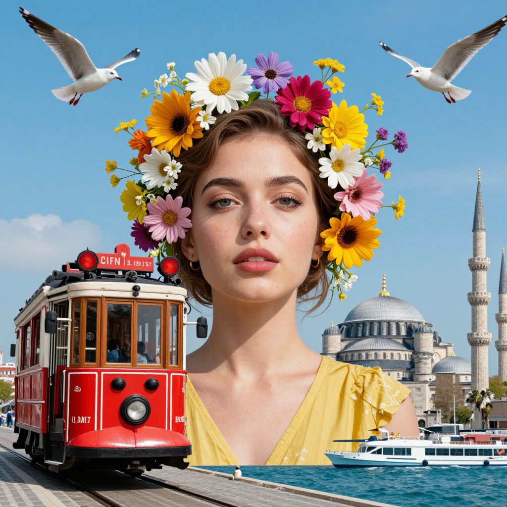 A digital collage features a woman's face adorned with flowers, Istanbul's old red tram, seagulls, the Blue Mosque, and the sea, creating a colorful spring effect.