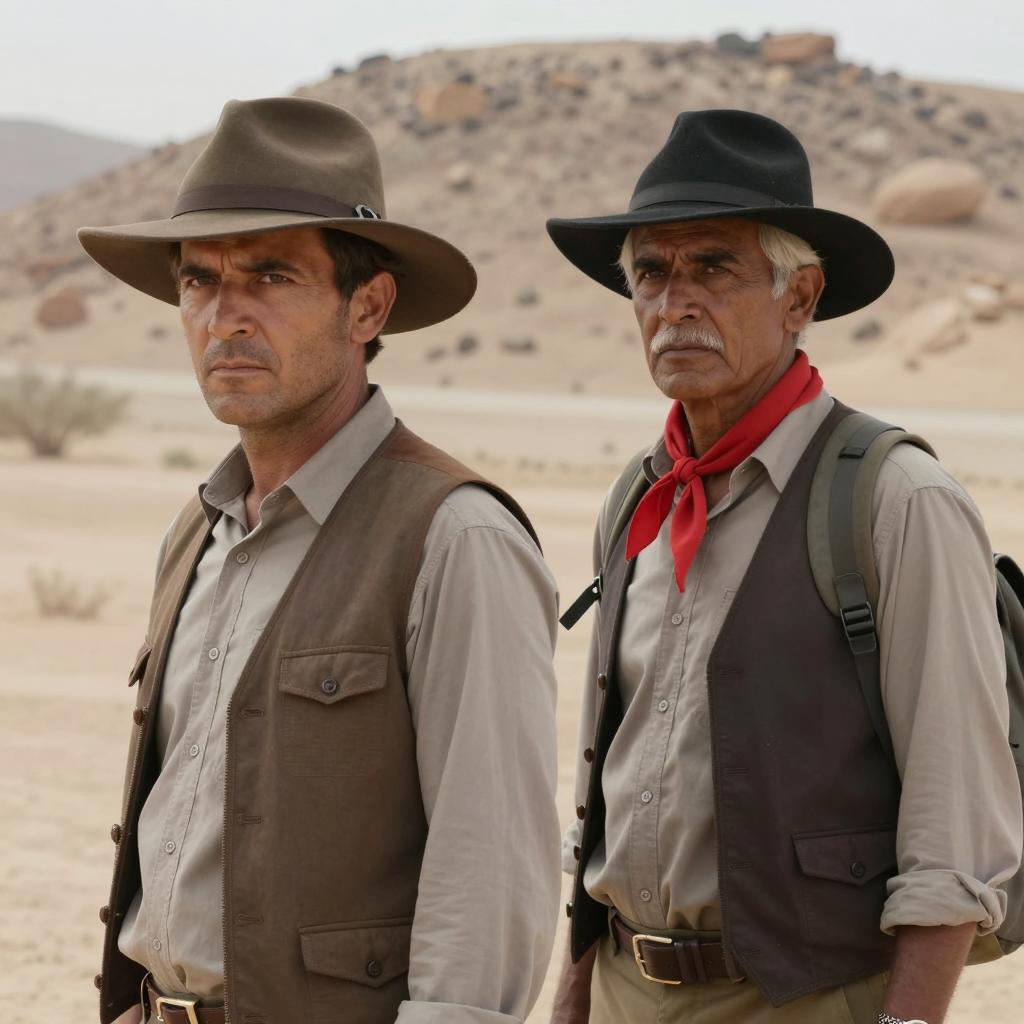 Two men facing each other outdoors. Older man with white beard, unkempt hair, open shirt, looking to the left. Younger man with dark beard, short hair, shirtless, looking at older man. Wooden cross structure in background. Bright blue sky.