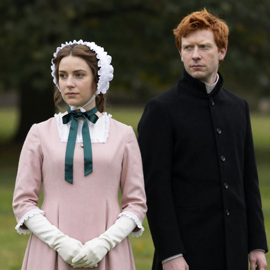 Photograph of two people in period clothing. Woman with light brown hair, white bonnet, pink dress with green ribbon, white gloves, looks left. Man with red hair, black coat, looks right. Background: blurred green trees. Both side by side, standing.