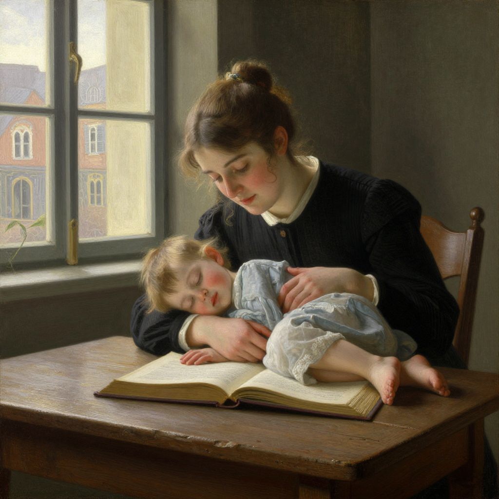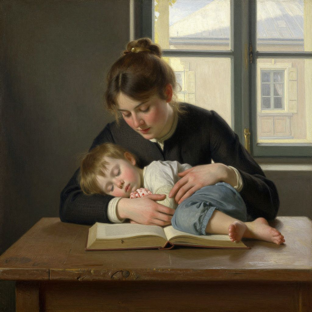 A serene, vintage-style painting reminiscent of Carl Wilhelm Holsøe's works, depicting a woman in a dark dress tenderly cradling a sleeping child on an open book atop a rustic wooden table, bathed in soft, natural light streaming through a window with a quaint architectural view.