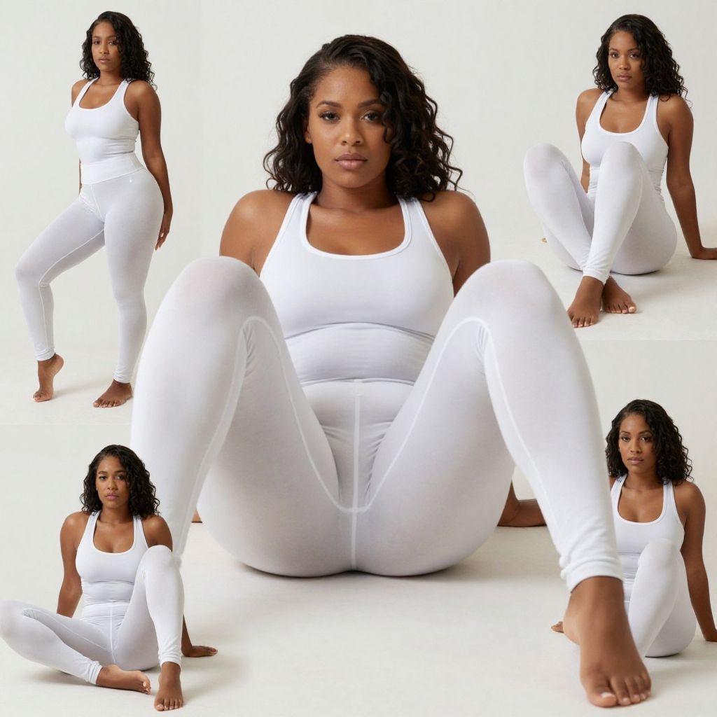Photograph collage of six poses featuring a Black woman with curly black hair, wearing a white tank top and white, form-fitting leggings. She has a medium-dark skin tone and an athletic build. The poses show her seated with legs spread, standing, and sitting with legs crossed. Her expression is neutral to slightly serious. The background is completely white, making her and her clothing stand out. The image highlights her toned physique and the snug fit of the leggings, emphasizing her curves. The lighting is even, with no shadows.