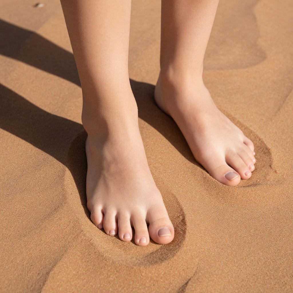 Photograph of a pair of light-skinned, bare feet standing on smooth, sunlit sand. The feet are slightly apart, with toes gently pressing into the fine, golden-brown sand. Shadows cast by the feet stretch to the left. The sand shows subtle, circular impressions around the feet. The image focuses on the texture of the sand and the smoothness of the skin, with bright sunlight highlighting the scene. No other objects or people are visible.