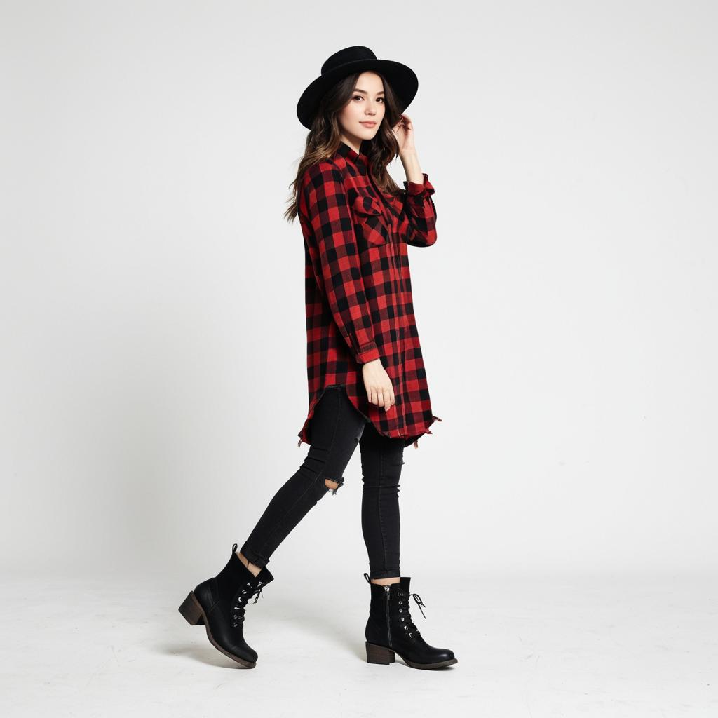 Woman, casual urban, red and black buffalo check shirt dress, mid-thigh length, roll-up long sleeves, black skinny distressed jeans, black ankle boots with low heel, wide-brimmed black felt hat, plain white background.