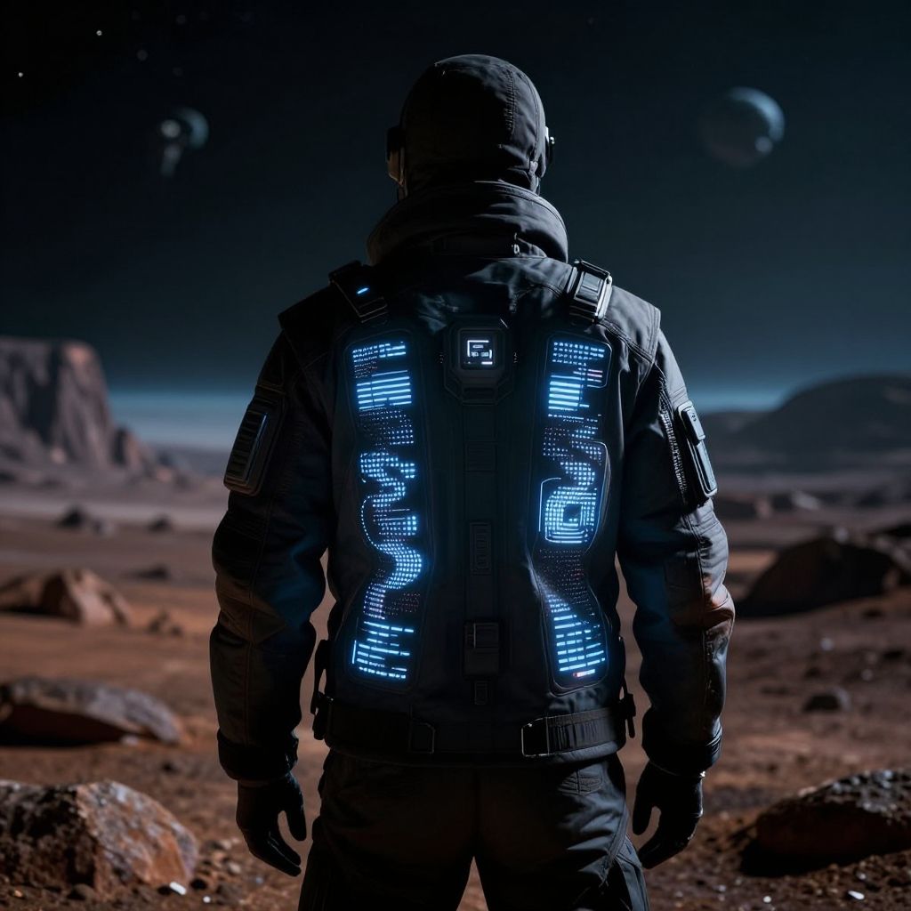Scifi jacket with built-in LED panels displaying shifting digital patterns, worn by a space explorer on an alien planet with a stark, rocky landscape, atmospheric lighting