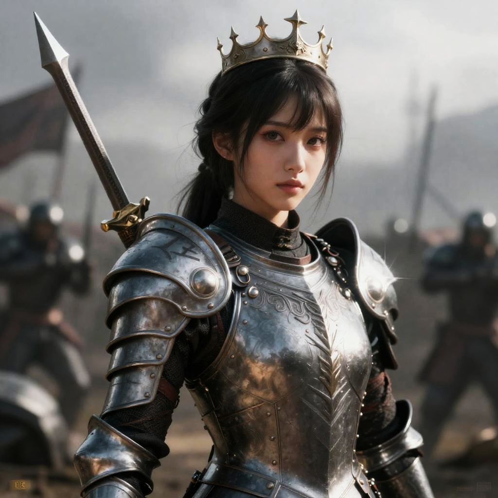 Armor, shield, shoulder_armor, crownя╝Мweapon(((half bodyя╝Мdynamic pose, War backgroundя╝Мbattlefield))), (ulzzang-6500-v1.1:0.8), (raw photo:1.2), ((photorealistic:1.4)), (upper body), best quality, masterpiece, an extremely delicate and beautiful, extremely detailed, CG, unity, 8k wallpaper, Amazing, finely detail, official art, extremely detailed CG unity 8k wallpaper, absurdres, incredibly absurdres, huge filesize, ultra-detailed, highres, beautiful detailed girl, extremely detailed eyes and face, beautiful detailed eyes, light on face, cinematic lighting, hyper detailed, lens flare, glow effect, depth of field, 1girl, war, paintings, sketches, (worst quality:2), (low quality:2), (normal quality:2), lowres, normal quality, ((monochrome)), ((grayscale)), watermark, signiture, logo, badhandv4Steps: 20, Sampler: DPM++ 2M Karras, CFG scale: 6, Seed: 2739333728, Size: 512x768, Model hash: 69bc54fc2c, Model: majicmixRealistic_v3, Denoising strength: 0.45, Clip skip: 2, ENSD: 31337, Hires upscale: 1.5, Hires steps: 5, Hires upscaler: Lanczos