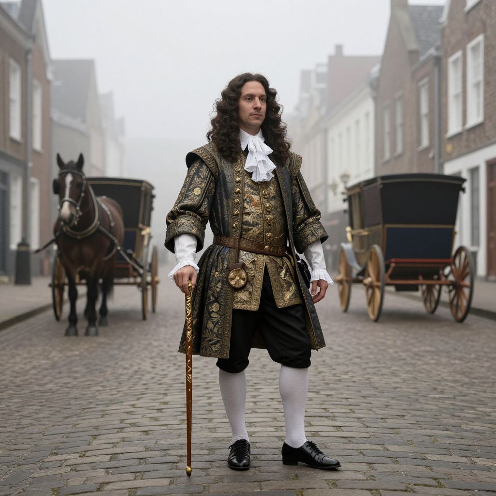 Photograph of a Caucasian man with long, curly black hair, dressed in 17th-century baroque fashion. He wears a gold-embroidered black coat, white ruffled shirt, black knee breeches, white stockings, and black shoes. He holds a wooden cane in his right hand. The background features a foggy, cobblestone street with two horse-drawn carriages, one on each side, and brick buildings with white-framed windows. The man stands confidently in the center, with a serious expression. The overall scene evokes a historical, European city setting.