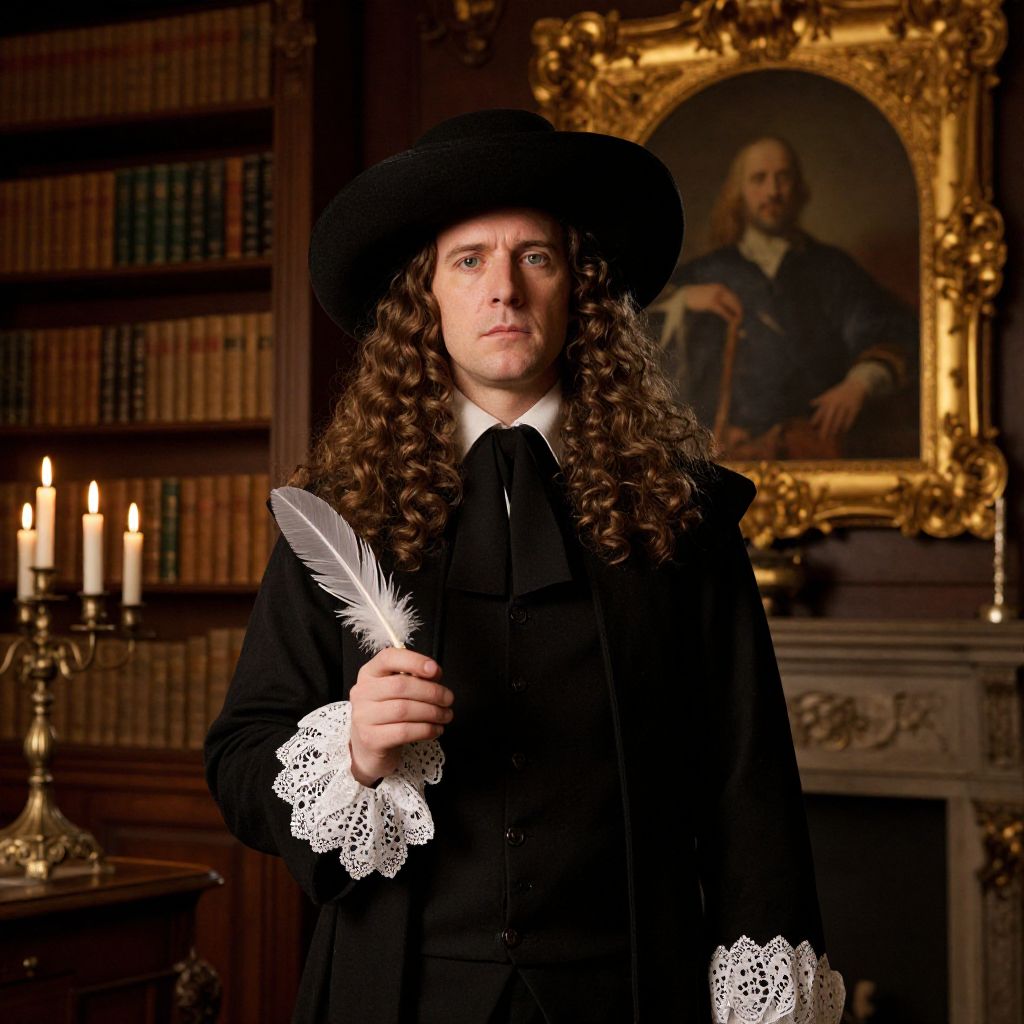 Photograph of a 17th-century European man in ornate gold-trimmed black suit, white ruffled shirt, and white stockings, standing
