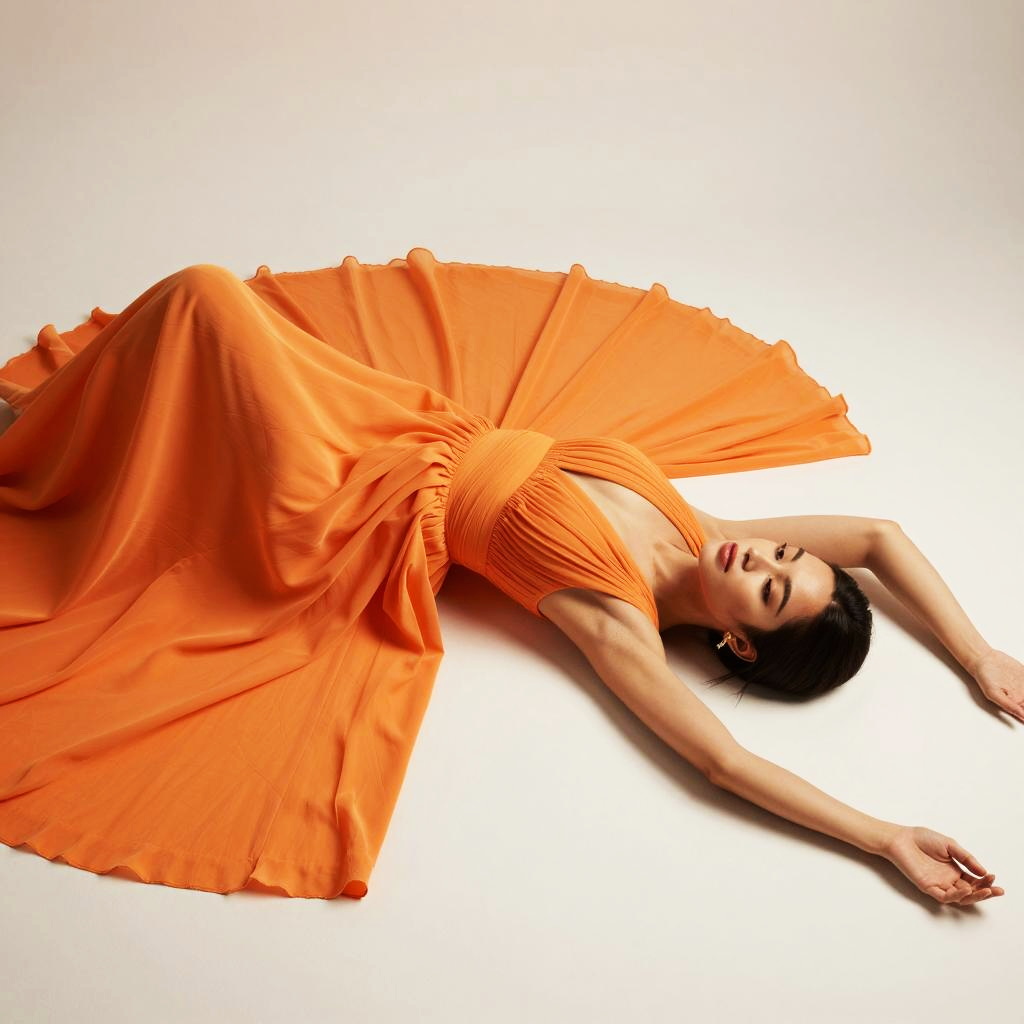 A stunning woman in an elegant orange gown lies gracefully on a light background, embodying a sense of serenity and style. The flowing fabric of her dress creates a visually captivating atmosphere, reminiscent of artistic photography that highlights beauty and fashion.