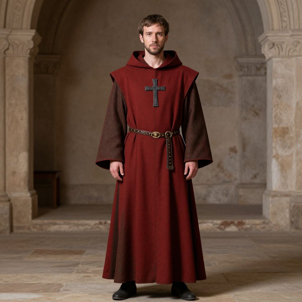 Renaissance Monk Costume, man in a red and brown robe and a cross