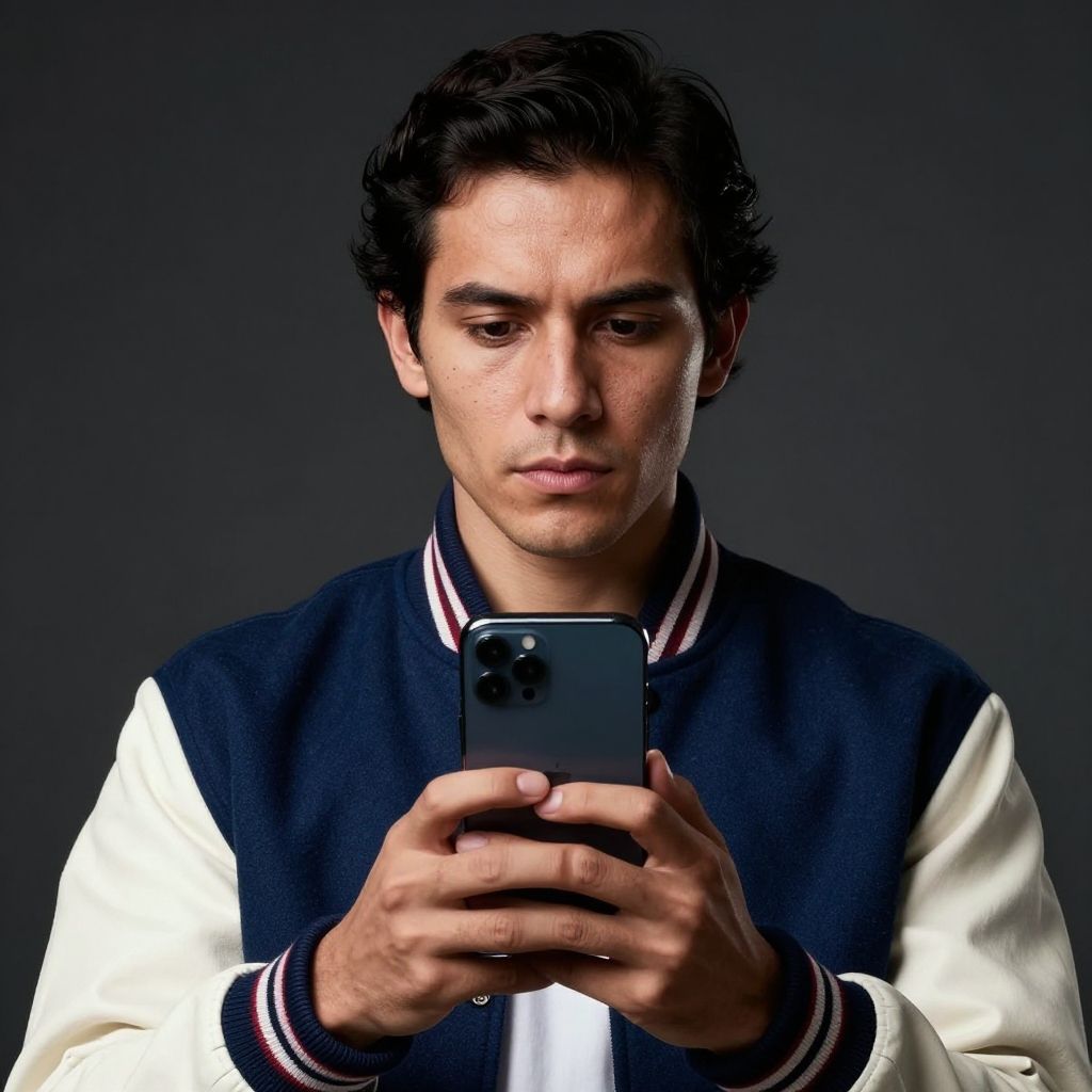 Photo realistic image of Jose Rizal in the present day, wearing varsity jacket, holding a smart phone, skin pores, Instagram shot, ultra realistic, 32K resolution, stylized digital artwork, vivid colors, intricate detailing, dramatic lighting, Realistic, Hyperrealistic, Hyperdetailed, masterpiece, best quality, 8k, golden ratio, Intricate, High Detail, matte skin, soft lighting, subsurface scattering, realistic, heavy shadow, studio photography