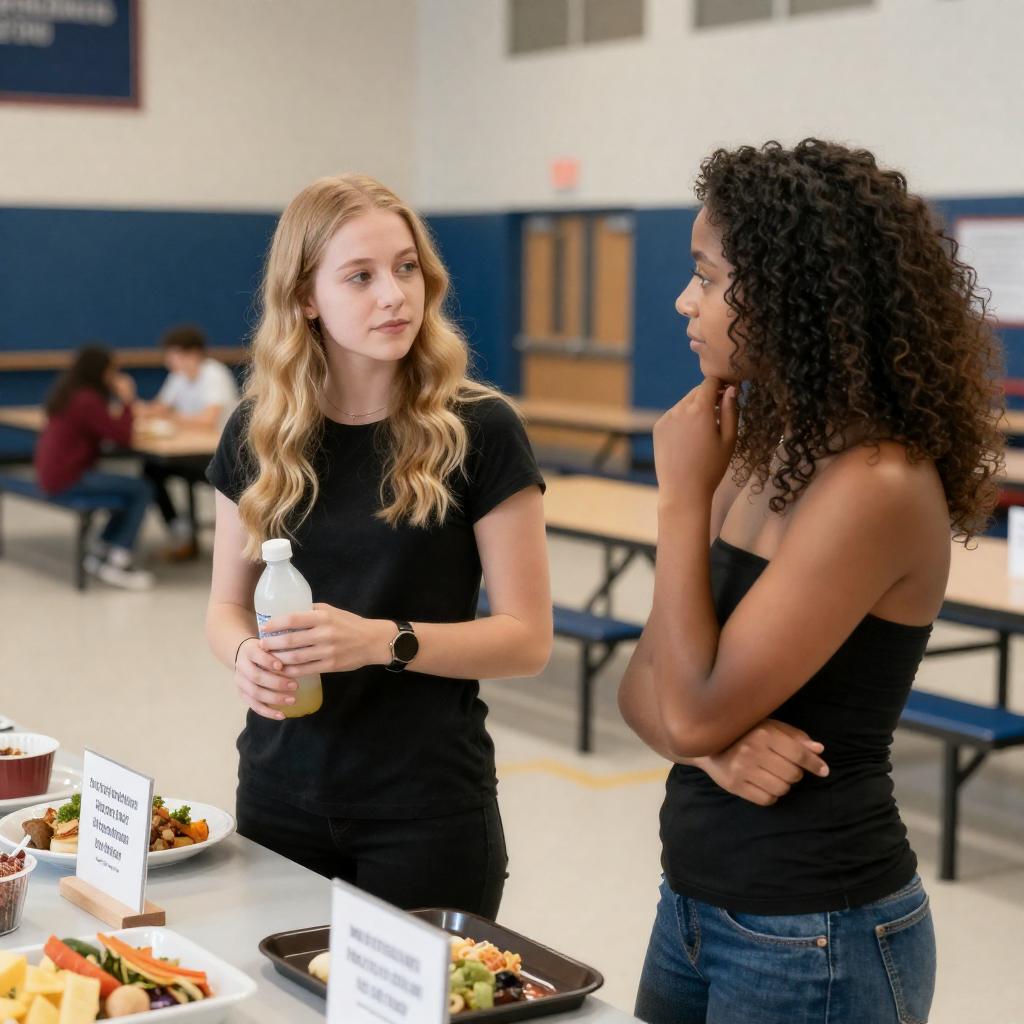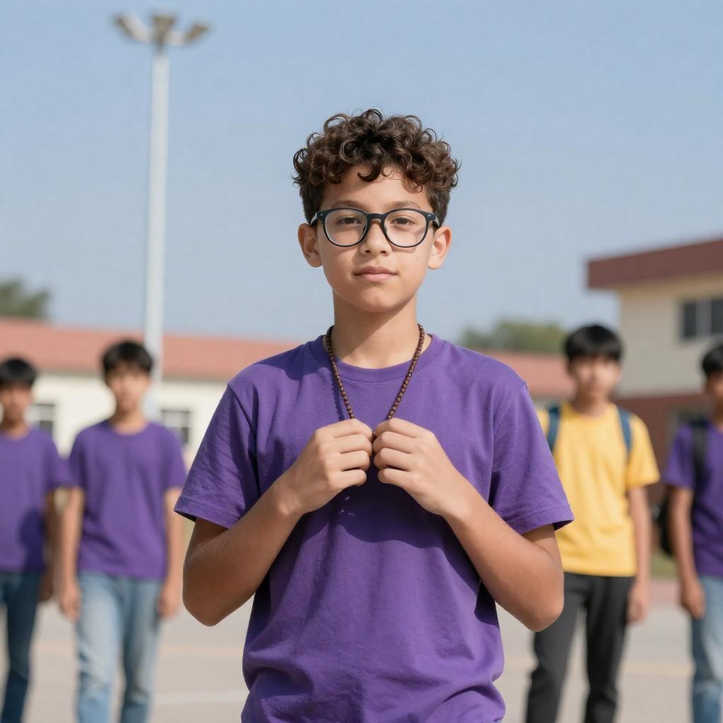 Photograph of five boys at a blue outdoor table. Three boys lean over, helping two seated boys with food. One boy with brown hair in a black shirt holds a burger. Another boy with curly hair in a green shirt looks at the food. Background: outdoor seating area with people and trees. Bright daylight.