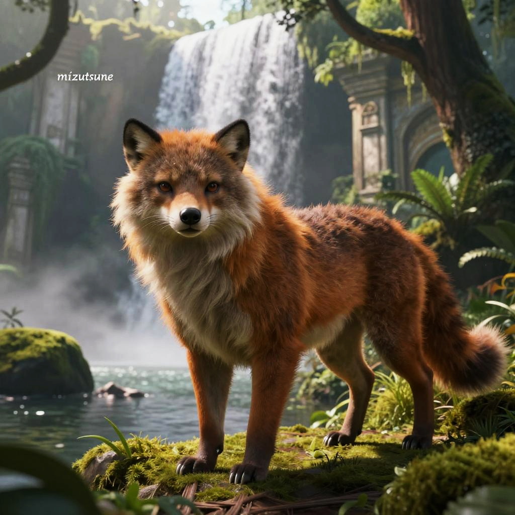 Uploaded on e621, (by Darkgem, by Null-Ghost, by Silverfox5213, by Chunie, by Pino Daeni), solo (quadruped feral:1.35) (((mizutsune))), ((detailed fluffy fur)), ((half-length portrait, three-quarter view)), , ((jungle, palace ruins, water, waterfall, fog, mist, morning)), (moss, tree, plant)(detailed background, depth of field, half body shadow, sunlight, ambient light on the body), (masterpiece, best quality, ultra realistic, 4k, 2k, (high detail:1.3), film photography, (3d \(artwork\):1.2), blender \(software\), (sharp focus:1.1), ray tracing, (unreal engine:1.3), RAW photo, photorealistic, analog style, subsurface scattering, photorealism, absurd res)