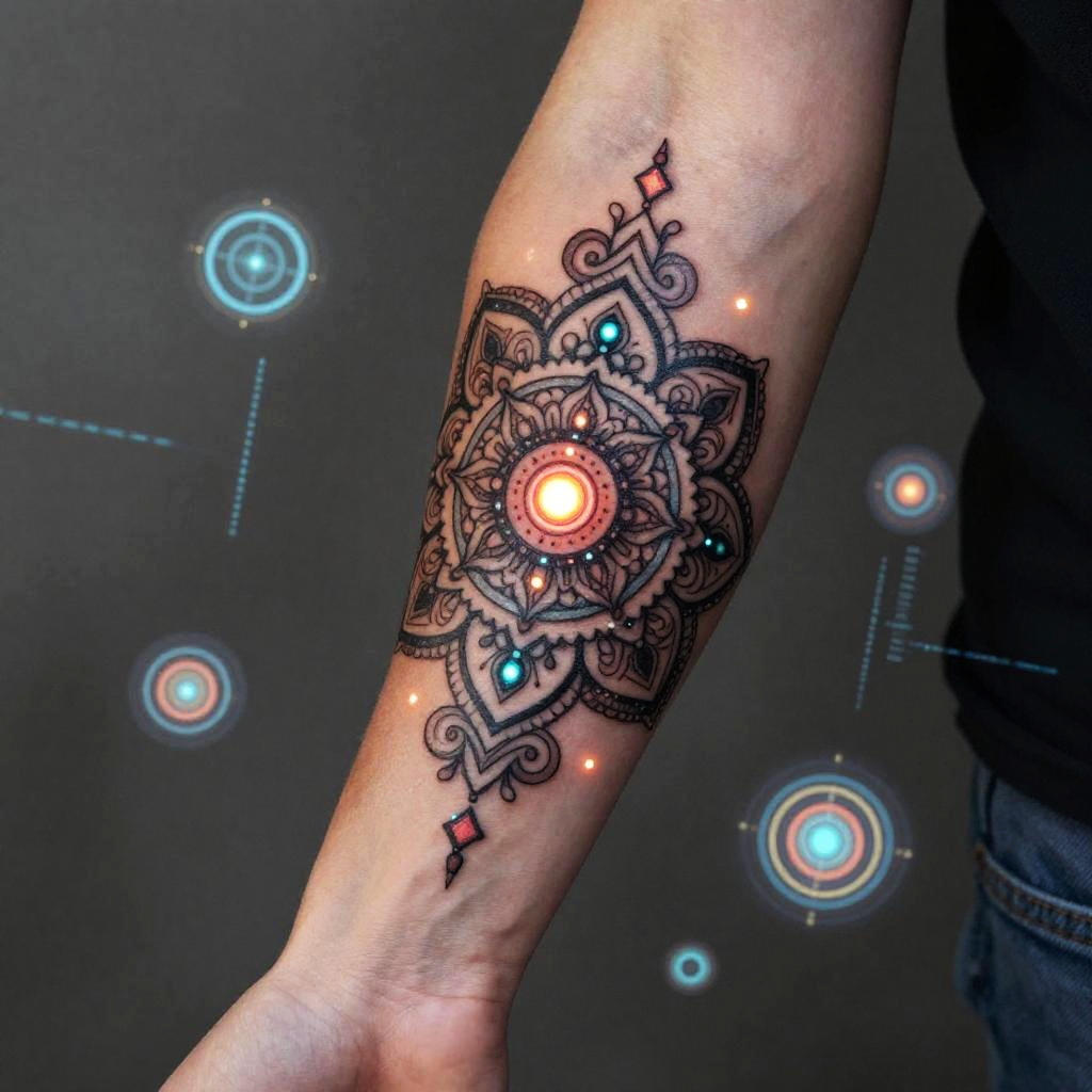 Free tattoo AI machine artfully etching complex mandala tattoos with glowing inks on a model's arm, surrounded by floating digital symbols and data streams, vibrant color palette, sci-fi inspired atmosphere