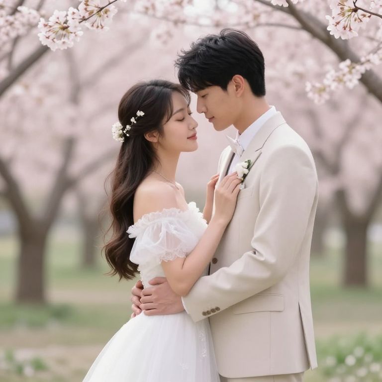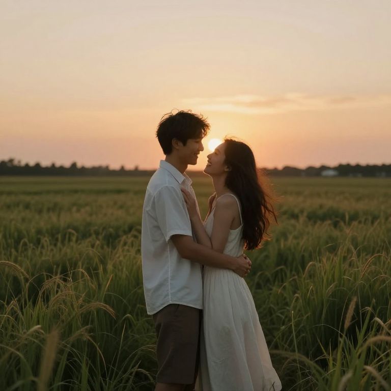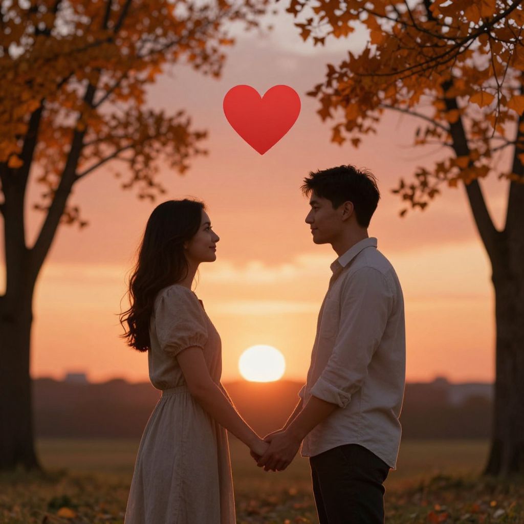 Photograph of a romantic sunset scene in a park. A silhouetted couple, a woman with long dark hair in a beige dress and a man with short dark hair in a white shirt, hold hands facing each other. They stand amidst autumn trees with orange leaves, against a glowing orange and pink sky. A bright red heart is digitally added above their heads. The sun is setting in the background, casting a warm glow. The couple is centered, with trees framing the image on both sides.