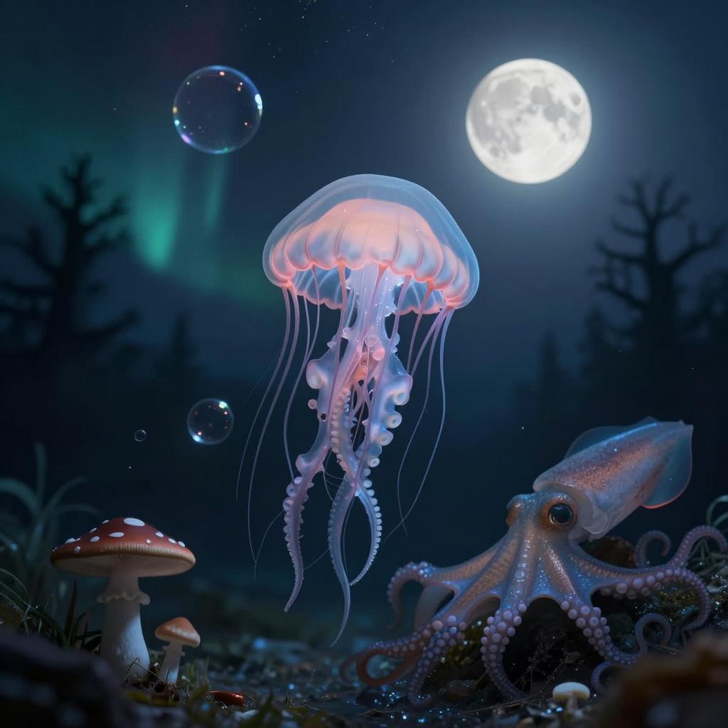 Glowing Jellyfish and Octopus Under Full Moon