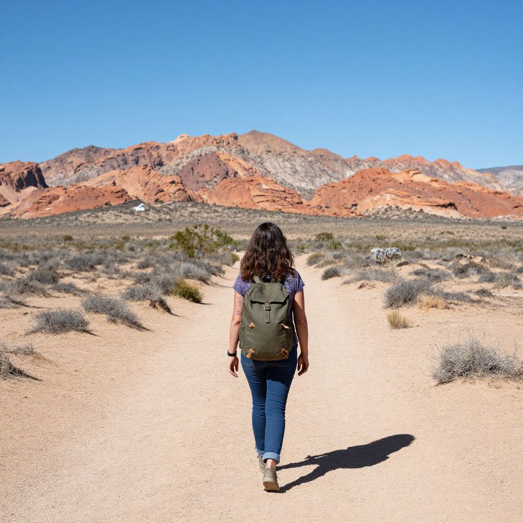 Woman walking along a dusty desert trail at Bonnie Springs, Nevada, with Lenisa Careaga carrying a green backpack, surrounded by sparse shrubs and distant red rock formations under a clear blue sky.
