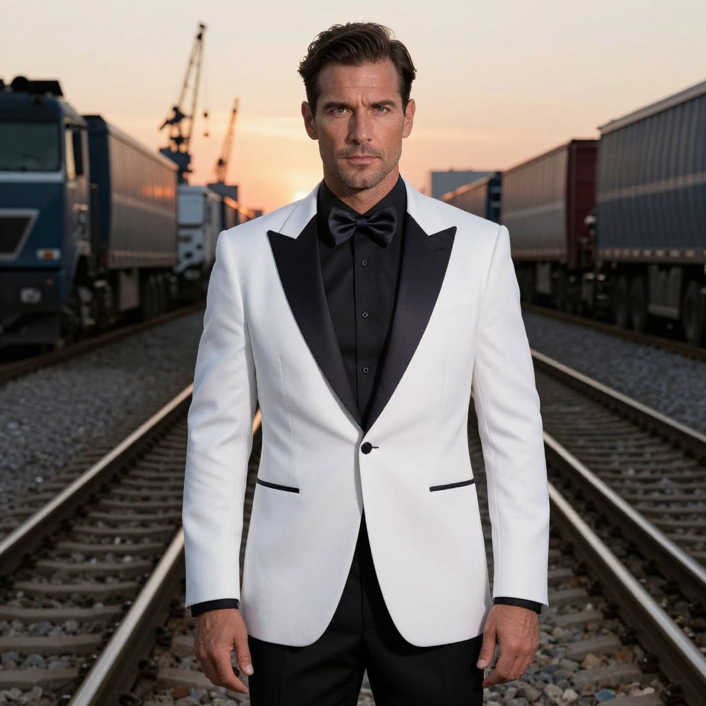 Photograph of a handsome Caucasian man with short, dark brown hair and light skin, standing on railway tracks at sunset. He wears a sharp, white tuxedo jacket with black lapels over a black dress shirt, paired with a black bow tie. His expression is serious and focused. The background features railway tracks extending into the distance, with cargo trains on either side. The sky is a gradient of orange and pink, indicating dusk. The image has a crisp, high-contrast style, emphasizing the subject's formal attire against the industrial backdrop.