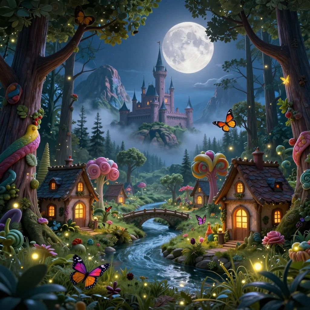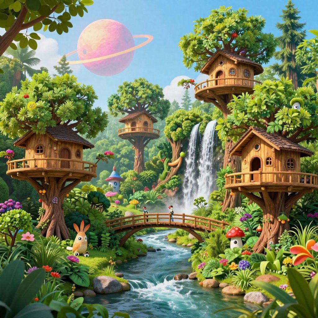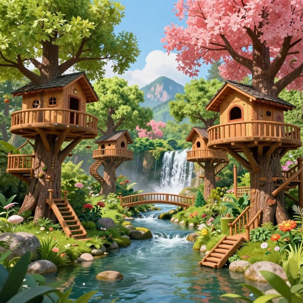 A vibrant fantasy scene featuring multiple colorful wooden treehouses built around large trees with lush green and pink foliage. A serene river flows between the trees, with cascading waterfalls and a mountainous backdrop under a bright blue sky. The scene includes wooden staircases, bridges, and balconies adding to the whimsical charm.