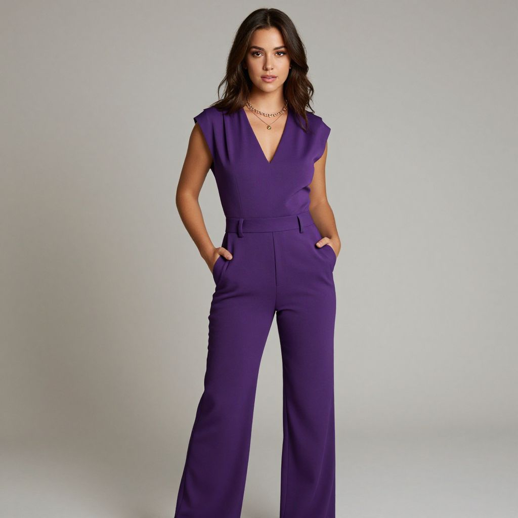 Photograph of a confident woman with long, dark brown hair standing against a plain, light gray background. She is wearing a vibrant purple, sleeveless, deep V-neck jumpsuit with flared pants and her hands in her pockets. She has a subtle, natural makeup look and wears a delicate necklace. The jumpsuit has a smooth, slightly tailored texture. Her stance is relaxed and she gazes directly at the camera with a neutral expression. The lighting is even, highlighting the rich purple color of the jumpsuit.