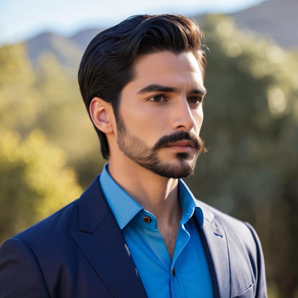 1boy, male focus, facial hair, solo, beard, black hair, shirt, upper body, short hair, looking to the side, outdoors, mature male, mustache, blue shirt, jacket, collared shirt, brown eyes, black shirt, suit, formal, closed mouth