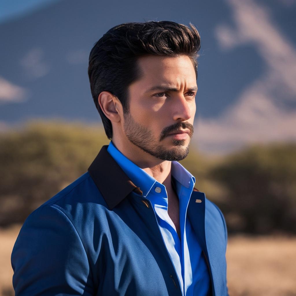 Close-up portrait of a serious young man with dark hair and beard, wearing a blue shirt and dark blazer, standing outdoors in a natural setting with blurred green foliage in the background.